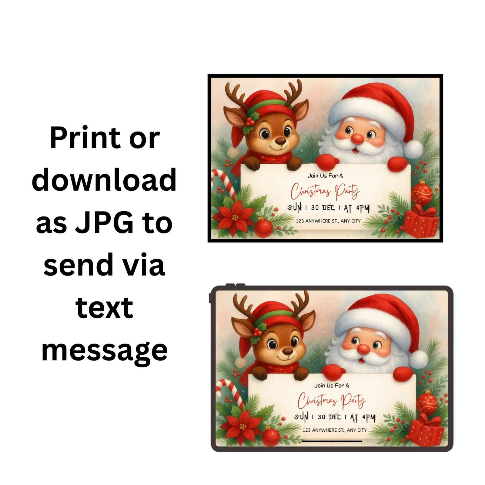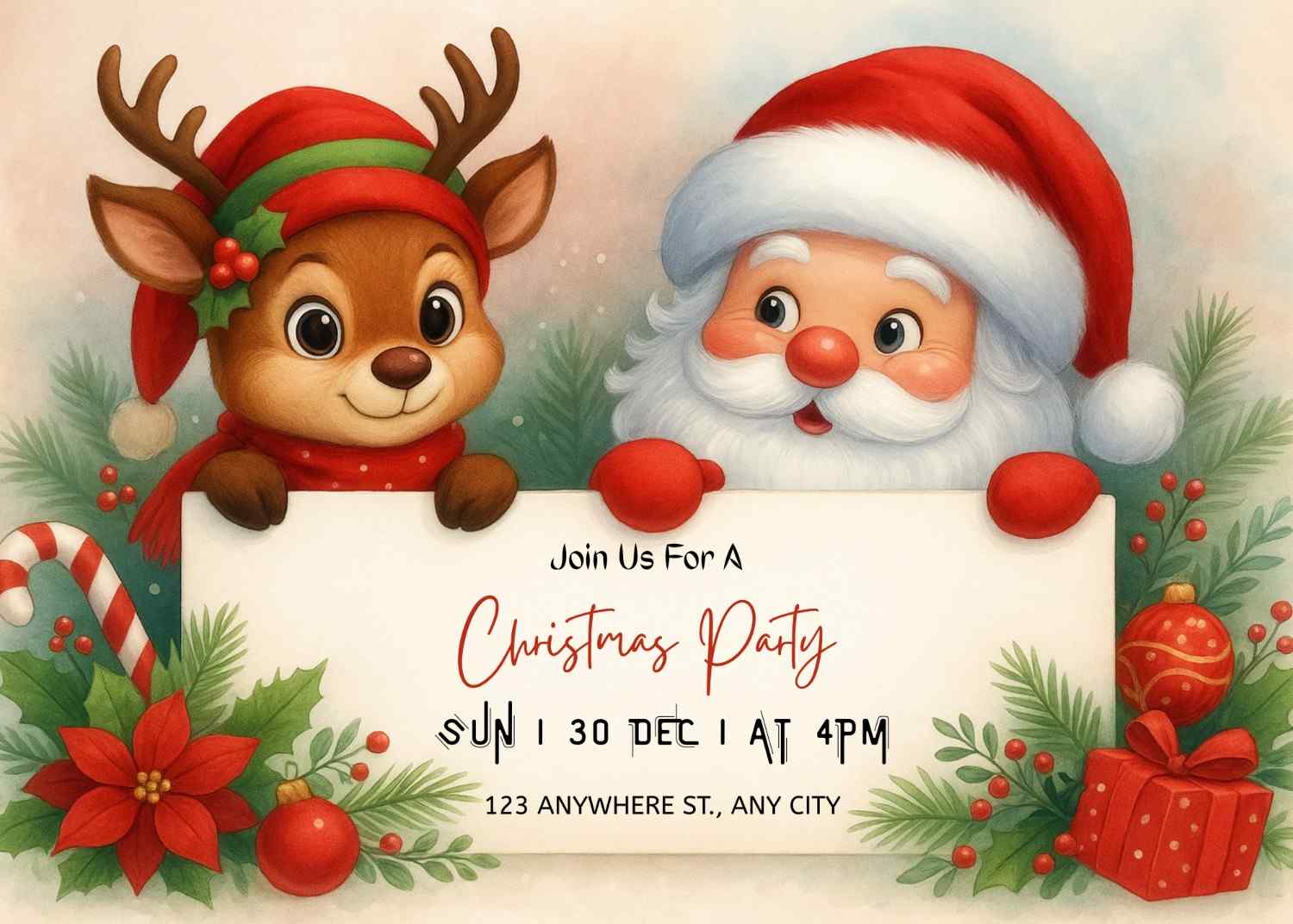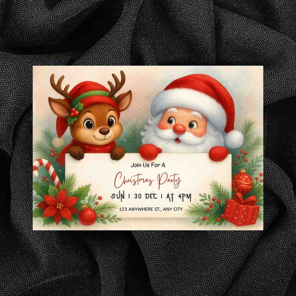 Celebrate the holidays with this Cute Santa and Reindeer Christmas Party Invitation Template — a charming, kid-friendly design perfect for Christmas parties, holiday gatherings, school events, family celebrations, and festive get-togethers. This printable holiday invite features an adorable Santa and reindeer illustration holding a sign with your party details, surrounded by poinsettias, candy canes, ornaments, and Christmas greenery.