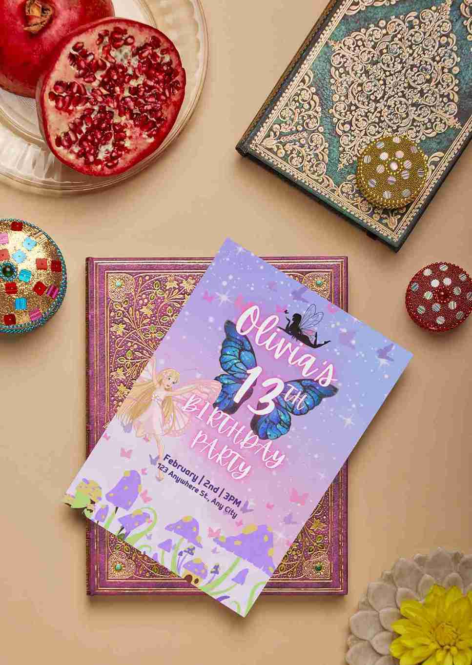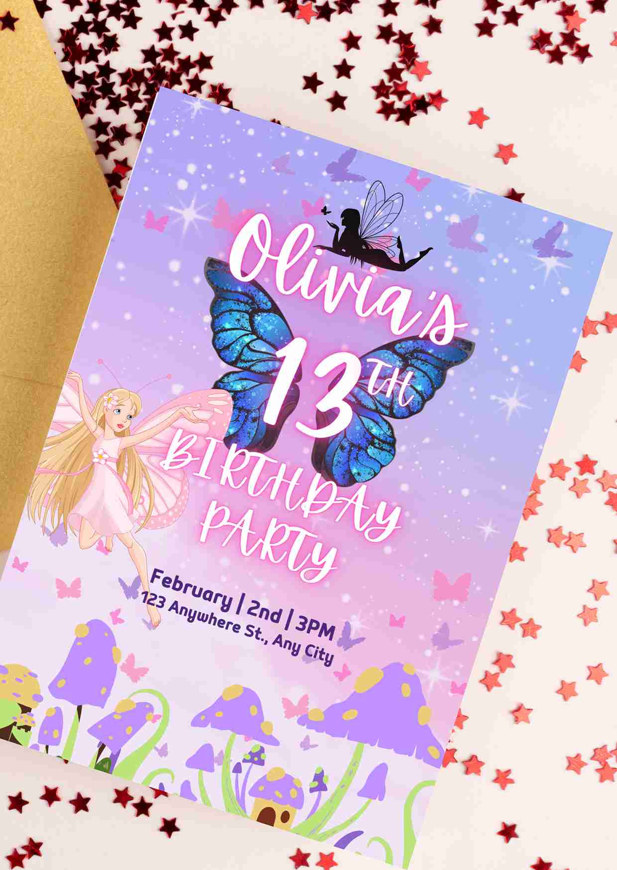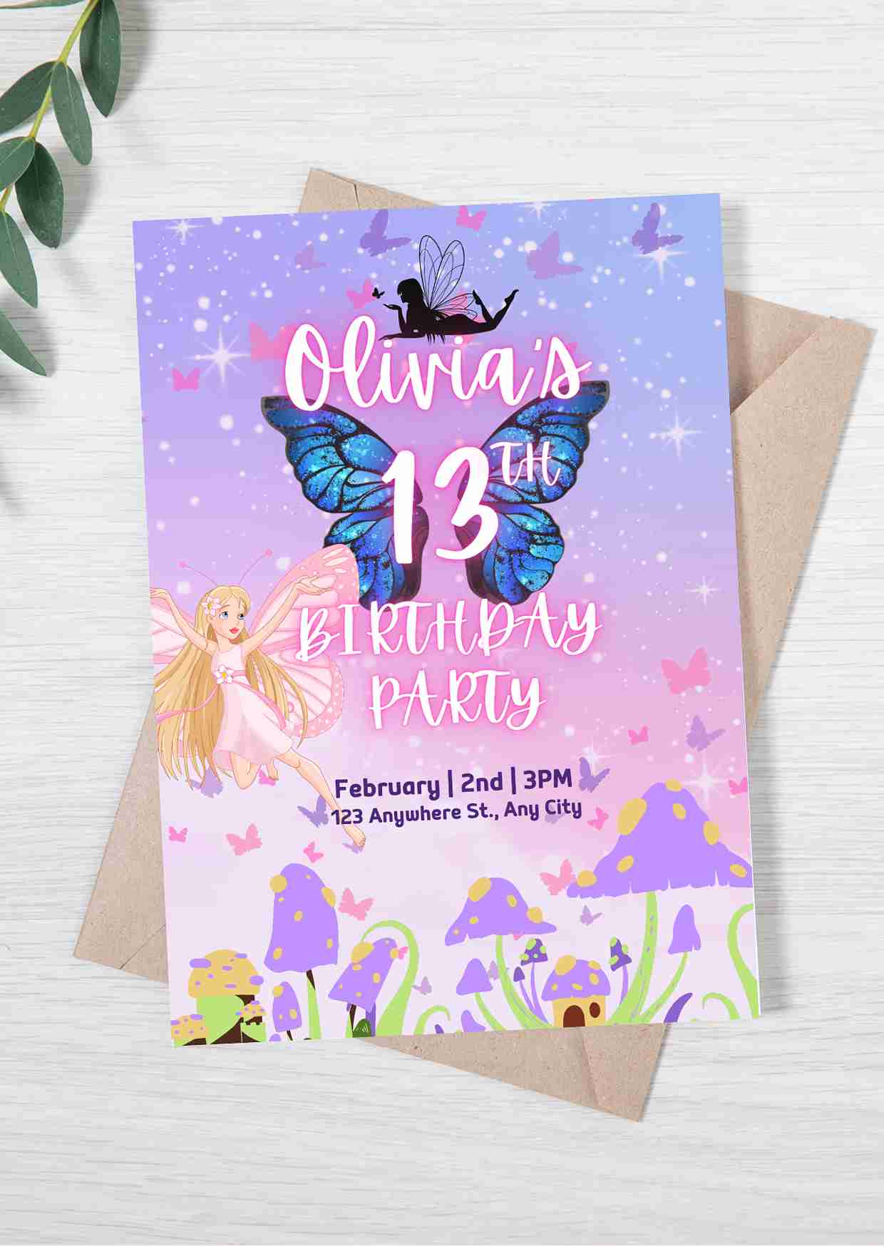 Magical fairy-themed 13th birthday invitation with butterflies and whimsical design. Editable & printable digital file for girls’ celebrations.